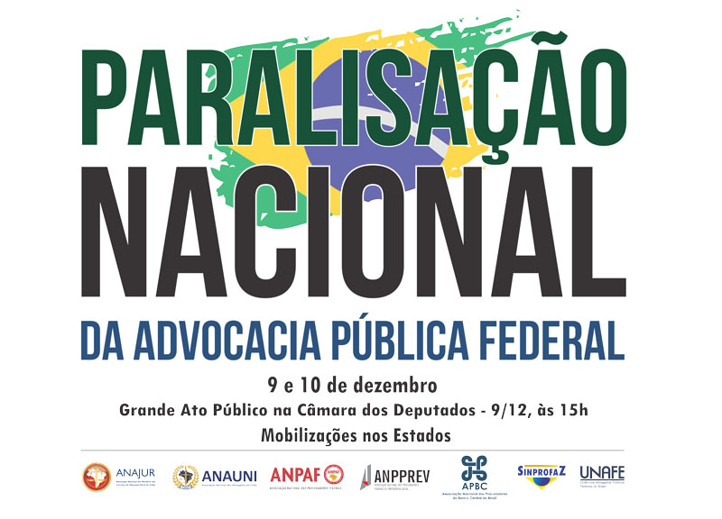 As entidades representativas da Advocacia Pública Federal estão organizando uma Paralisação Nacional, que ocorrerá nos dias 09 e 10 de dezembro, com a participação dos Advogados da União, Procuradores da Fazenda Nacional, Procuradores Federais e Procuradores do Banco Central do Brasil.