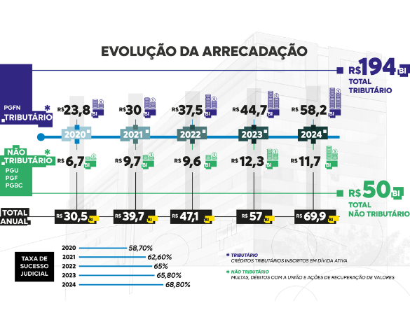 A atuação da Advocacia-Geral da União (AGU) resultou na recuperação de R$ 244,2 bilhões para os cofres públicos nos últimos cinco anos. O valor se refere à recuperação de créditos tributários e não tributários e reflete a melhora crescente nos resultados da instituição. Entre 2020 e 2024, a arrecadação total aumentou 129,18%, subindo de R$ 30,5 bilhões para cerca de R$ 70 bilhões. No mesmo período, a Taxa de Sucesso Judicial da AGU cresceu de 58,7% para 68,8%. O número representa o percentual de vitórias da AGU em ações na Justiça.
