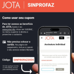 Para ter acesso ao benefício, acesse www.jota.info/assinatura/1 e crie uma assinatura individual utilizando o endereço de e-mail. Ao preencher o cadastro, não inclua os dados do cartão de crédito: insira o código SINPROFAZ2024 no espaço reservado a cupons de desconto. A partir daí, procuradoras e procuradores da Fazenda Nacional já podem aproveitar o ano inteiro de acesso gratuito e irrestrito ao conteúdo do JOTA!