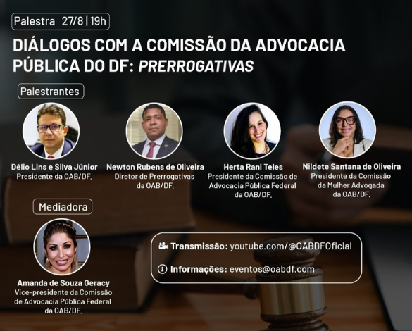 O evento contará com as participações de Délio Lins e Silva Júnior, Presidente da OAB/DF, Newton Rubens de Oliveira, Diretor de Prerrogativas da OAB/DF, e Nildete Santana de Oliveira, Presidente da Comissão da Mulher Advogada da OAB/DF. A mediação ficará a cargo de Amanda de Souza Geracy.