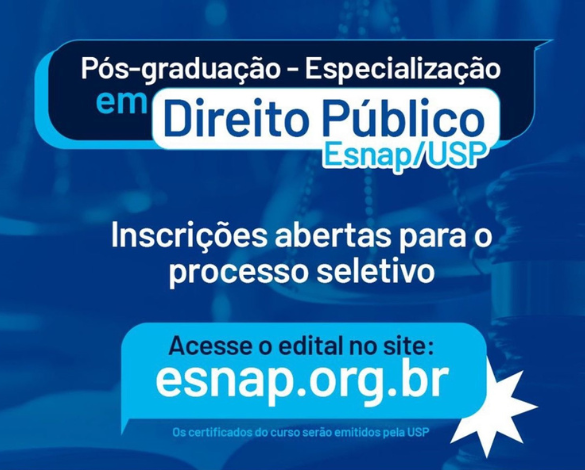Estão abertas as inscrições para o processo seletivo da pós-graduação lato sensu em Direito Público da Escola Nacional da Advocacia Pública – ESNAP. O curso, que tem o apoio do SINPROFAZ, é resultado de uma parceria com a Faculdade de Direito da Universidade de São Paulo – USP. A pós-graduação é especialmente voltada ao aperfeiçoamento científico a respeito de temas relacionados à missão constitucional do advogado público. Aproveite!