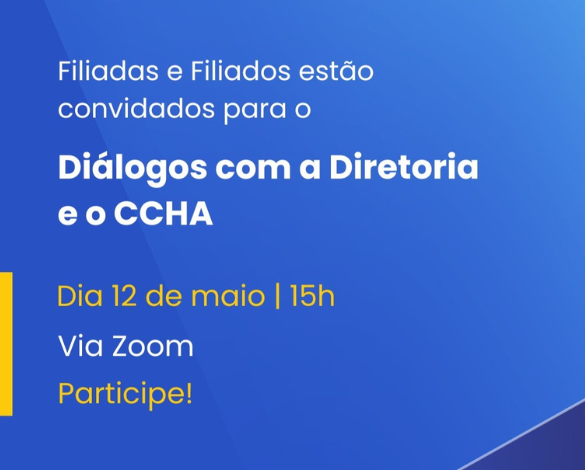 O SINPROFAZ convoca filiadas e filiados para a live Diálogos com a Diretoria e o CCHA. O evento ocorrerá no dia 12 de maio (segunda-feira), às 15h, via Zoom. O link para acesso será oportunamente disponibilizado no grupo de Informes do WhatsApp.